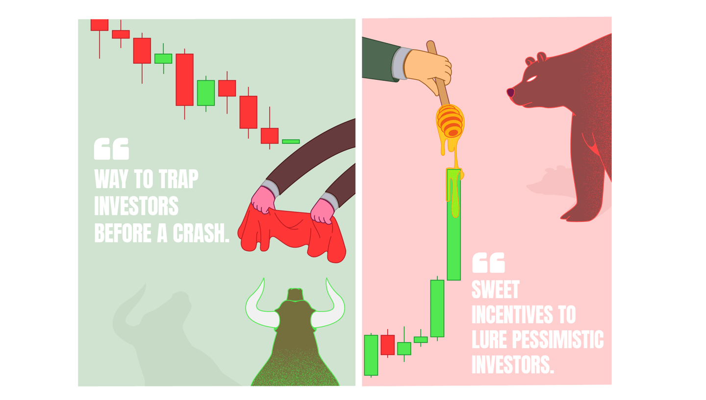 Created a three-panel narrative illustration showing bull traps, bear traps, and direct market control.